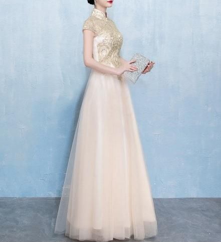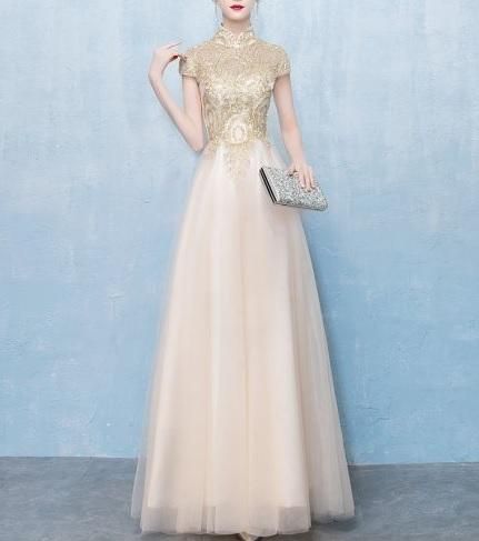 ゴールドの刺繍がドレスを豪華な印象に仕上げてくれます。