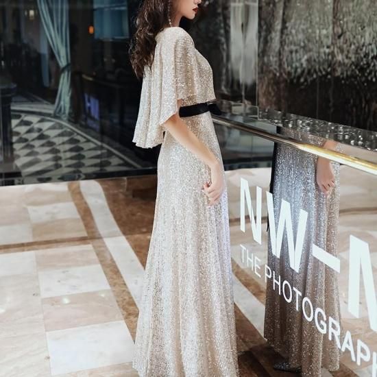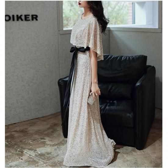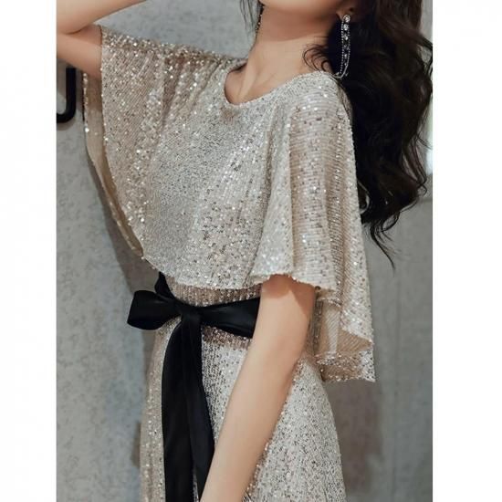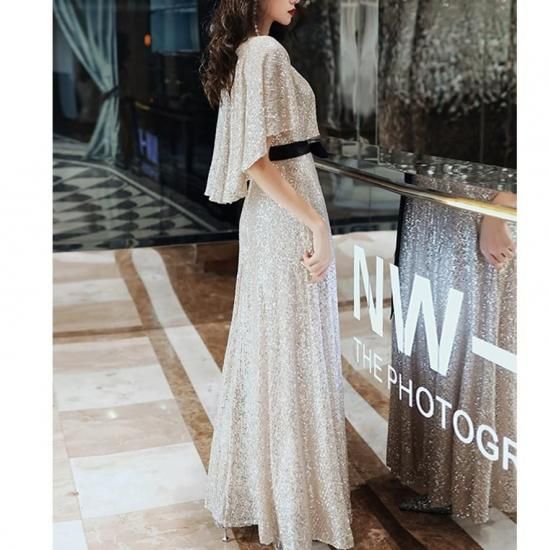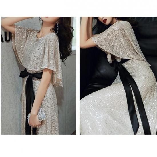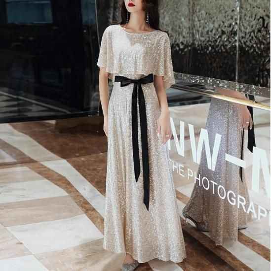 繊細なラメが輝くロングドレスに、ウエストリボンがアクセントを添えたデザイン。