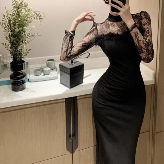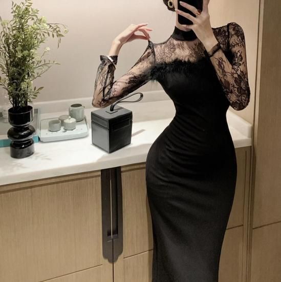 繊細なレースが魅力のタイトシルエットのロングドレス。