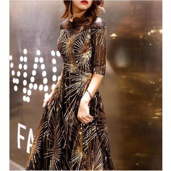 スパンコールのまばゆい輝きを放つロング丈ドレス。