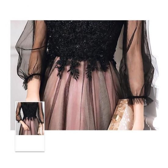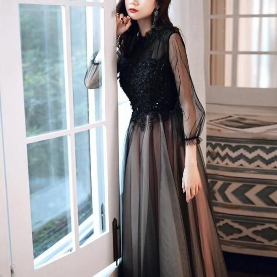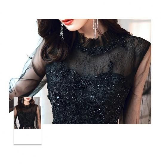 シンプルで大人っぽいブラックドレス。シアースリーブが二の腕を自然にカバーしてくれます。