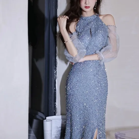 - イブニングドレスは肌の露出が高く、胸元や背中が開いたゴージャスなデザインのドレス。