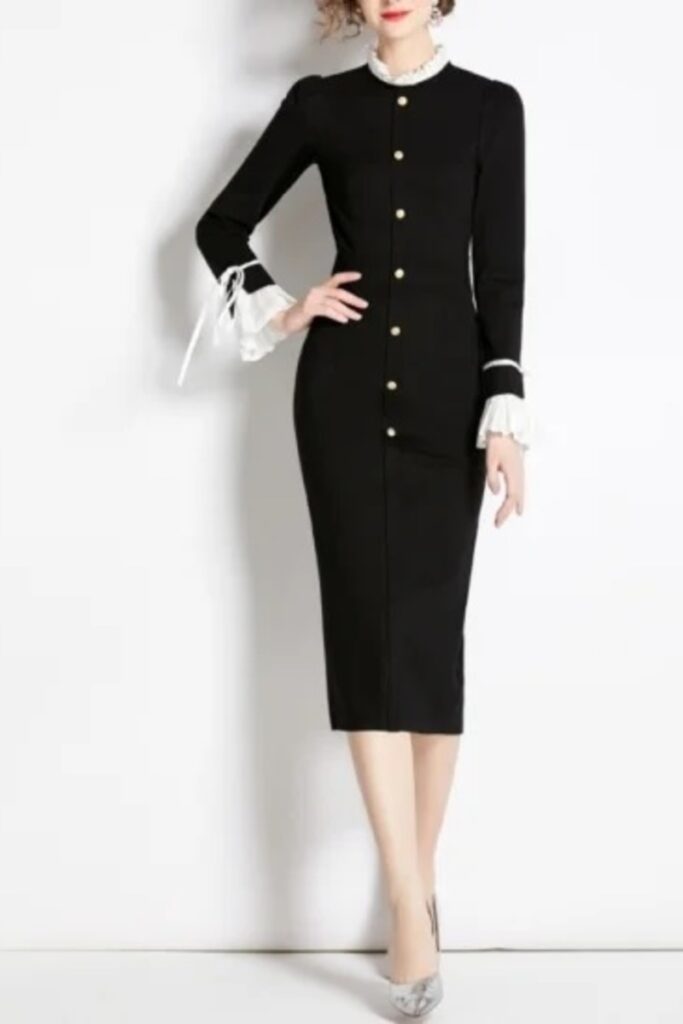 ブラックのスーツワンピースは、シンプルにまとまり、着回しもしやすいため人気です。